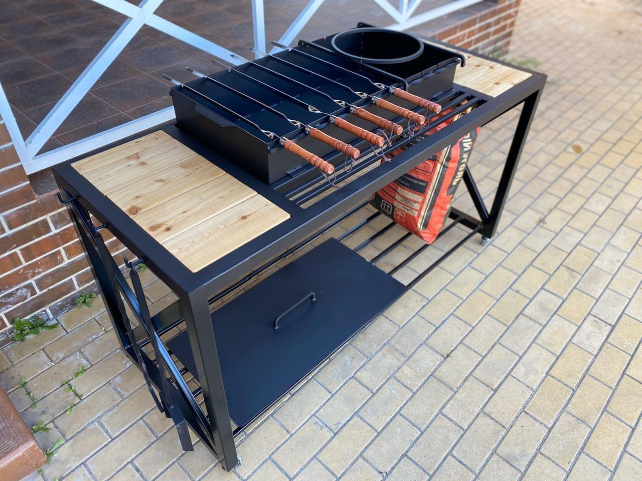 Все мангалы лофт из металла оснащены жаровней и удобным столиком из дерева. У каждого лофт мангала есть нижний ярус, на который можно укладывать дрова и другие предметы, необходимые для приготовления продуктов. Также можно заказать мангал лофт с крышей, защищающей жаровню при плохих погодных условиях. По желанию можно дополнительно изготовить подставку под казан, держатель для бутылки, крышку для мангала или решетку-гриль.